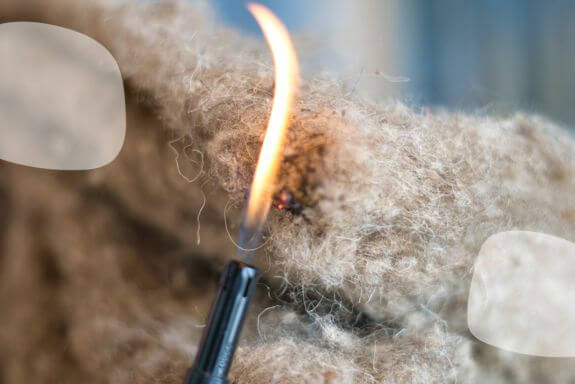 Brandwerendheid van isolatieDankzij het gebruik van 100% zuivere schapenwol, de speciale ISOLENA-verwerkingstechnologie en de innovatieve, biocidevrije wolbescherming Ionic Protect, behaalt onze schapenwolisolatie – afhankelijk van het product en de structuur – een brandklasse van B1, C of D volgens EN 13 501-1. De natuurlijke vezel van schapenwol heeft een zelfontbrandingstemperatuur van 560 - 600°C, wat ongeveer twee keer zo hoog is als die van hout (270°C). Bij blootstelling aan hitte smelt de wol weg van de warmtebron zonder te druppelen. | ![]() |