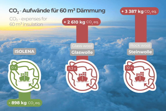 ![]() | BesparingsvoorbeeldBij een vergelijking van de milieu-impact van verschillende isolatiematerialen voor een vrijstaand huis met 60 m³ isolatievolume wordt duidelijk hoeveel CO₂ kan worden bespaard met schapenwolisolatie. ISOLENA schapenwolisolatie bespaart 898 kg CO₂-eq met een GWP totaal (A1-A3) van -19,3 kg CO₂-eq. Glaswolisolatie veroorzaakt 2.610 kg CO₂-eq. In vergelijking bespaart ISOLENA 3.508 kg CO₂-eq. Steenwolisolatie veroorzaakt 3.387 kg CO₂-eq. ISOLENA bespaart in dit geval 4.285 kg CO₂-eq. De CO₂-uitstoot van glaswol komt overeen met een containerschip dat 8,3 keer de aarde rondvaart. Bij steenwol zou hetzelfde schip zelfs 10 keer rond de wereld varen. |