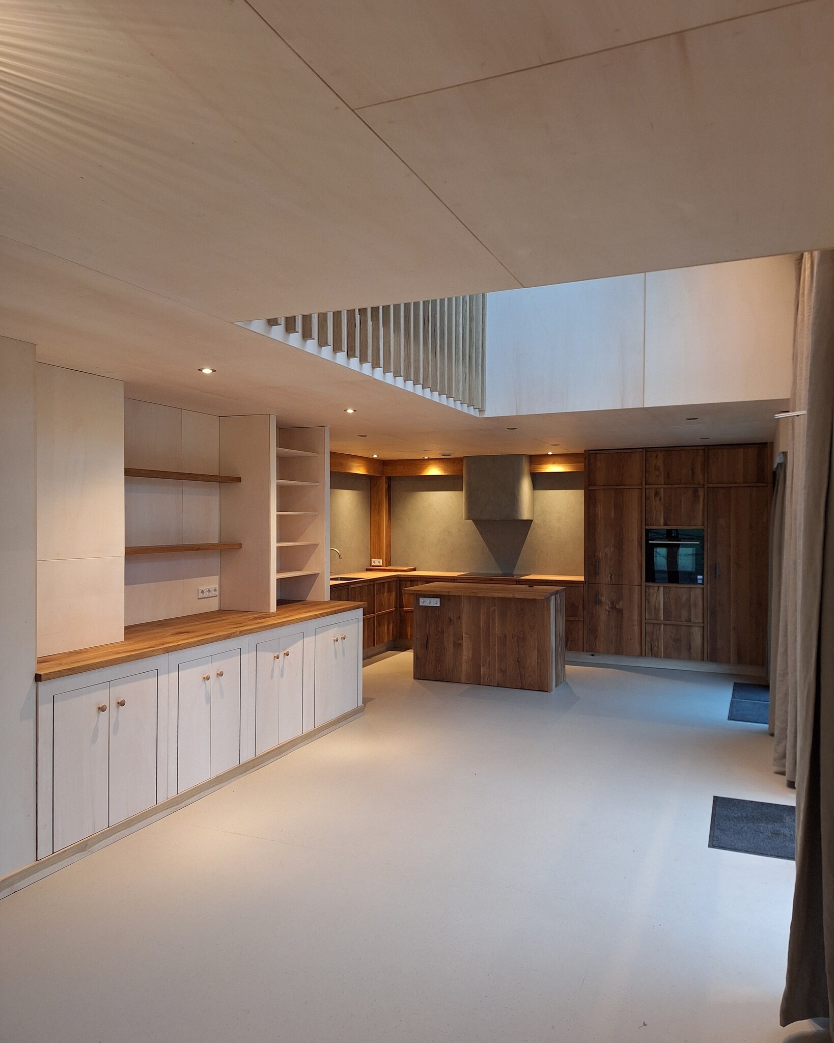 De woningscheidende wanden zijn in verband met de eisen rond brandveiligheid afgewerkt met Fermacell-platen en daaroverheen Auro leemverf. Dit zorgt voor een vochtregulerende en ademende wand. “Afwisseling is niet geforceerd in het ontwerp, maar juist op een functionele manier toegepast. Vorm volgt functie", legt Teun uit.