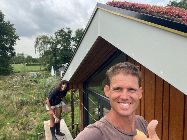 Op het dak liggen zonnepanelen aan de zuidzijde, ook voor buren die minder zon hebben. De noordzijde is voorzien van een sedum-kruidendak. Voor de zomer bouwde Wim een pergola met klimplanten en bloemen voor natuurlijke beschutting.