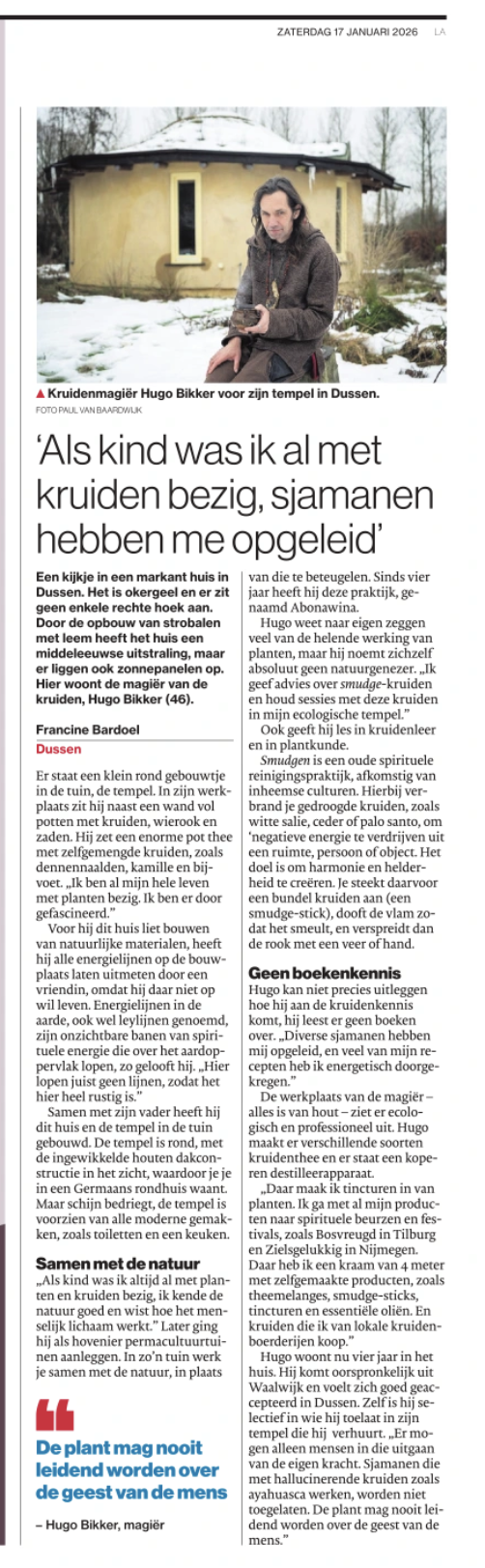 Hugo maakt in zijn werkplaats verschillende soorten kruidenthee, vertelt hij in een interview met het Brabants Dagblad op 17 januari 2026. In de werkplaats staat een koperen destilleerapparaat. "Daar maak ik tincturen in van planten. Ik ga met al mijn producten naar spirituele beurzen en festivals, zoals Bosvreugd in Tilburg en Zielsgelukkig in Nijmegen. Daar heb ik een kraam van 4 meter met zelfgemaakte producten, zoals theemelanges, smudge-sticks, tincturen en essentiële oliën. En kruiden die ik van lokale kruidenboerderijen koop", vertelt hij aan de krant.