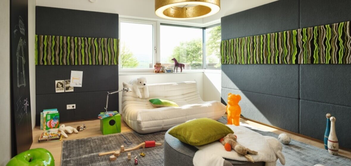 Het hart van deze woning wordt gevormd door geprefabriceerde bouwelementen van kleikorrels met uitstekende eigenschappen voor akoestiek, brandwerendheid en een aangenaam binnenklimaat. Om de isolatie en leefkwaliteit verder te verbeteren, is gekozen voor schapenwol als aanvulling op de kleikorrels. Deze combinatie zorgt voor een natuurlijke balans: warm in de winter, koel in de zomer. Daarnaast is in de woning gebruikgemaakt van Silentum akoestische panelen in verschillende ruimtes, zoals de kantoor-, woon- en eetkamer. De panelen optimaliseren de omgevingsgeluiden en dragen bij aan een warme, comfortabele sfeer. In het plafond van de woonkamer is Isolena Optimal Plus-isolatie verwerkt, eveneens op basis van schapenwol.