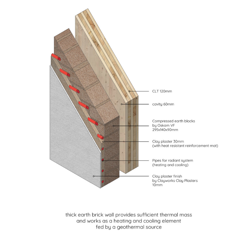 Om het binnen nog behaaglijker te maken, loopt door het midden van de woning een dikke aarden muur die is opgebouwd uit leemstenen. Deze binnenmuur werkt als verwarmings- en verkoelingselement. Ook de buitenmuren en het dak van de woning zijn goed geïsoleerd met natuurlijke houtvezelisolatie. Hier is gebruikgemaakt van Gutex Multitherm. Houtvezelisolatie is een volledig hernieuwbaar product, gemaakt van reststromen van houtzagerijen uit het Zwarte Woud. Het materiaal werkt vochtregulerend en beschermt niet alleen voor warmte en kou van buitenaf, maar zorgt ook voor een goede geluidsdemping en een aangenaam woon- en leefcomfort.