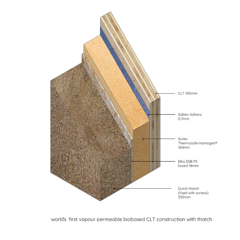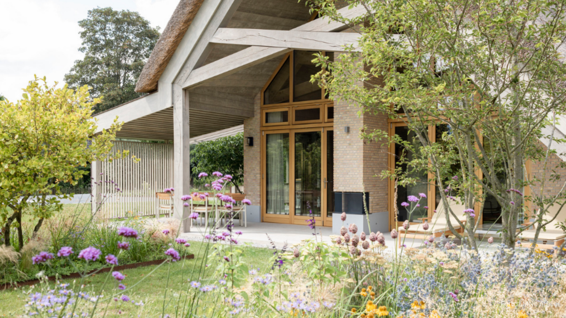 Een woning in de vorm van een oer-Hollandse boerderij, maar met innovatieve biobased oplossingen in de opbouw. Dat is deze prachtige moderne woning, ontworpen door LMNL office. Dit Veldhuis heeft een Nederlands rieten dak en lokaal geproduceerde bakstenen buitenmuren. De opbouw van de biobased kruislings gelamineerde houtconstructie (CLT), houtvezelisolatie en lokaal Nederlands riet is volledig dampopen en daarmee de eerste in zijn soort ter wereld.