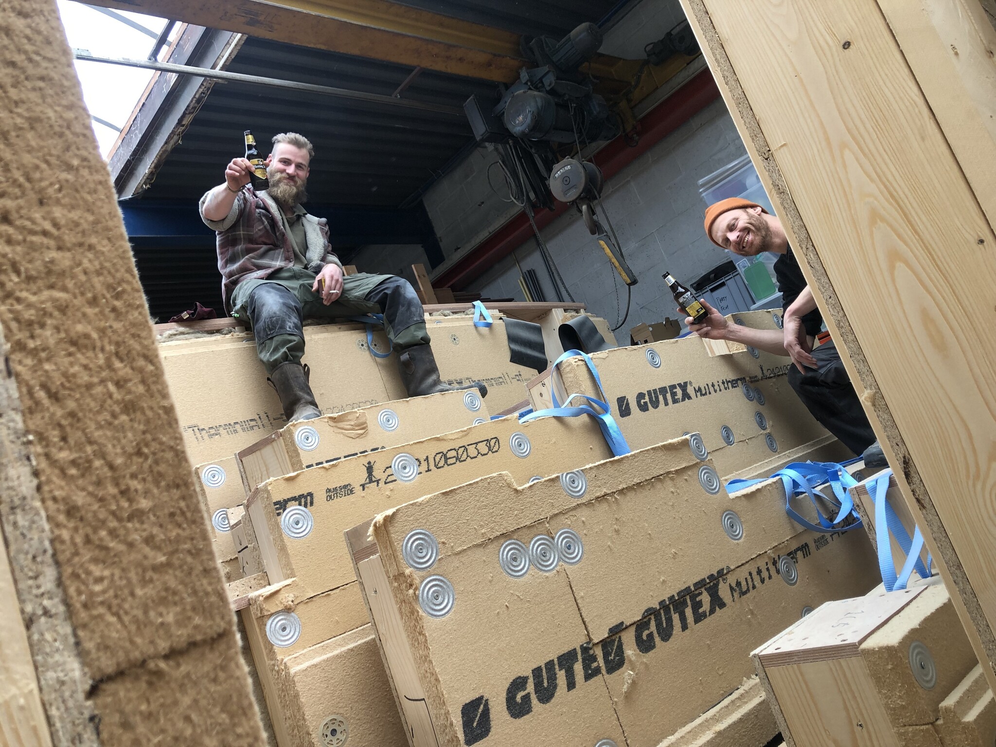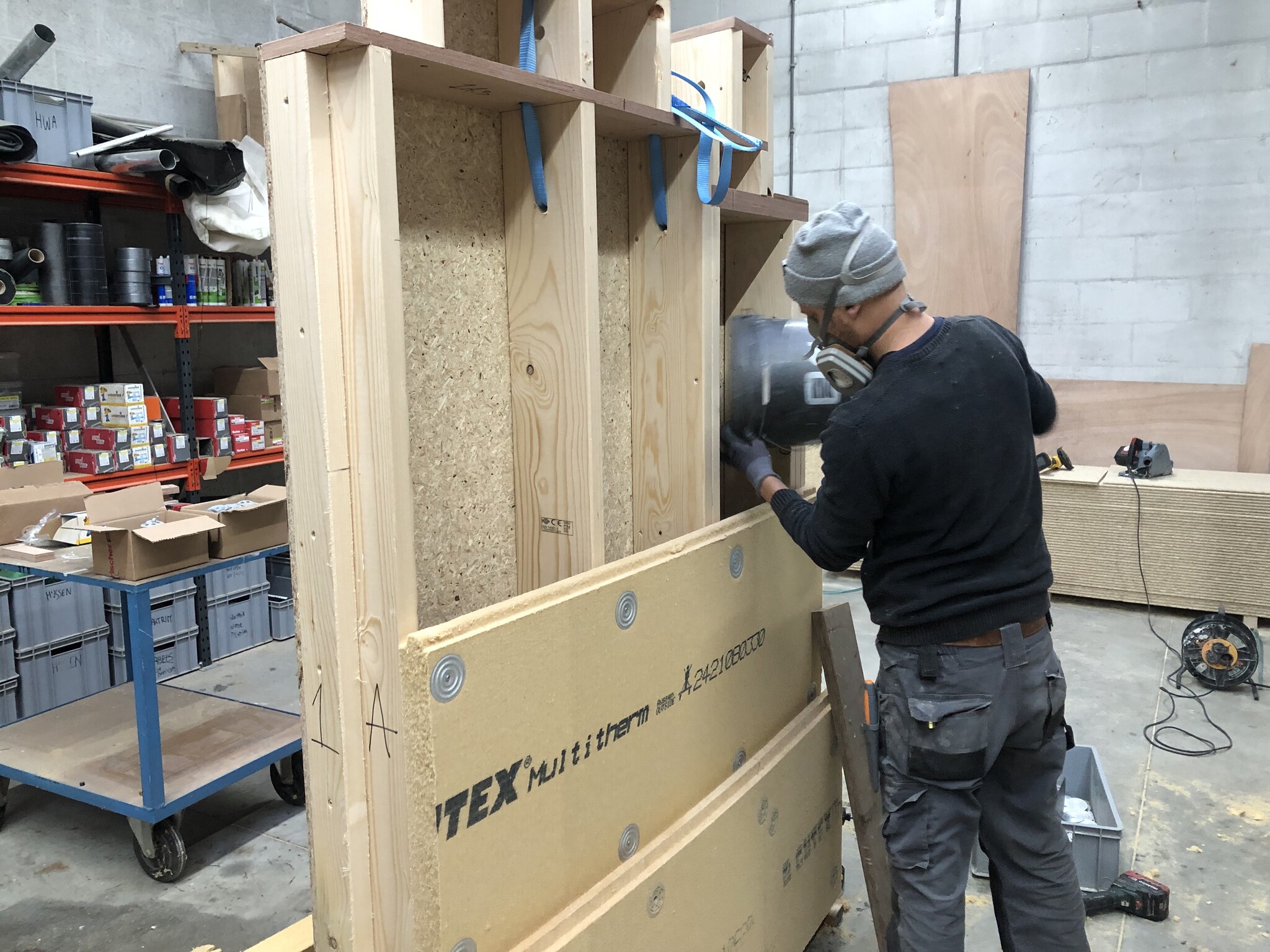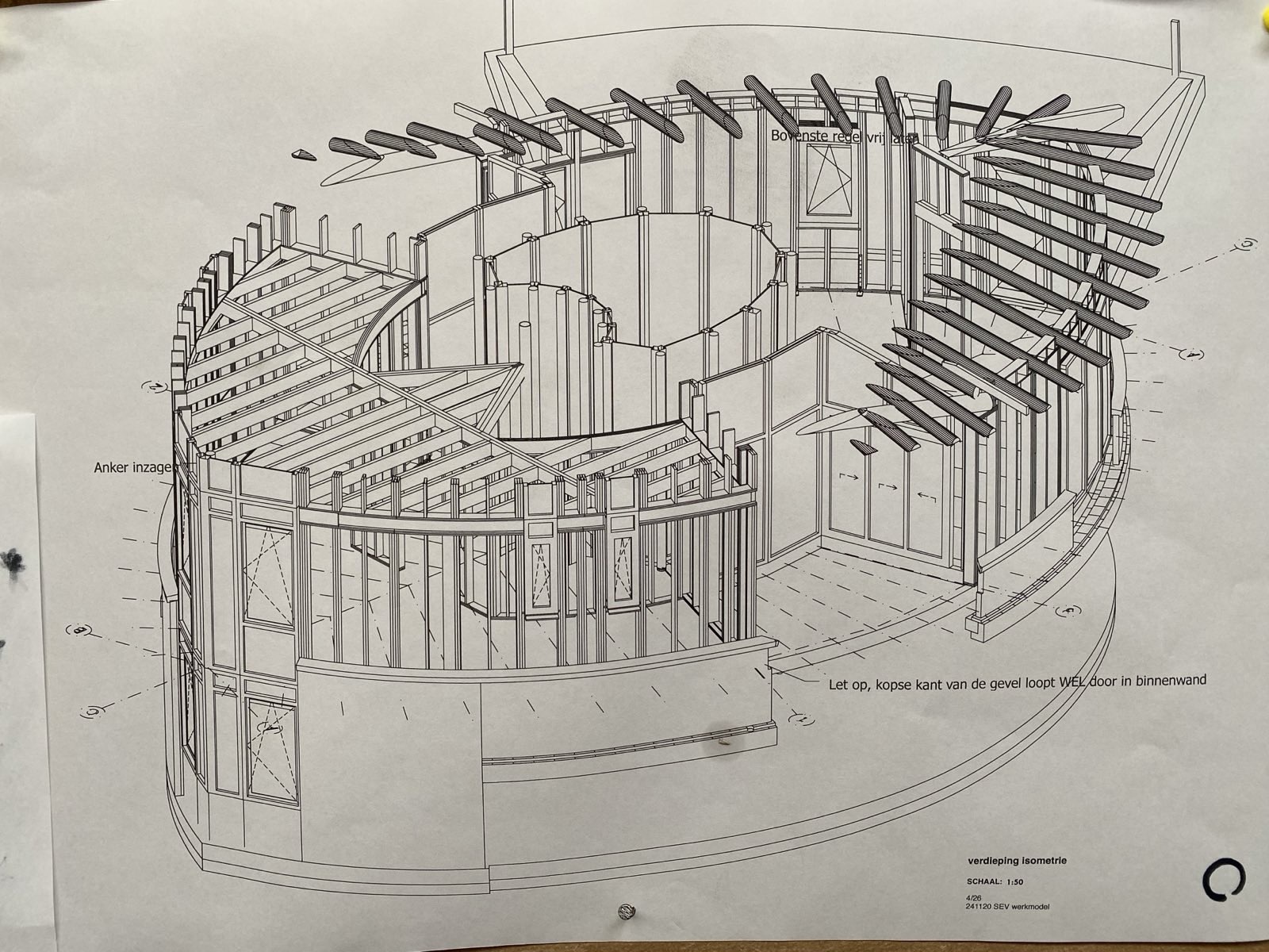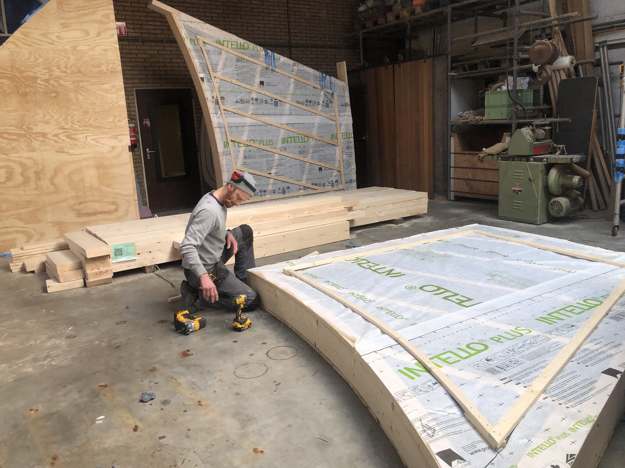 Het team van Open bouw & ontwerp is in hun werkplaats in Rijen bezig met het bouwen van de gebogen houtskeletbouw elementen die straks samenkomen in deze bijzondere bosvilla. Midden in een open plek tussen de beukenbomen ontstaat een huis dat niet boven, maar in het landschap lijkt te liggen. Centraal in het ontwerp staat de open binnenplaats met een Tasmaanse boomvaren, een stille getuige van hoe natuur en wonen hier samensmelten. Aan weerszijden zorgen terrassen aan de noord- en zuidkant voor een vloeiende overgang tussen binnen en buiten.