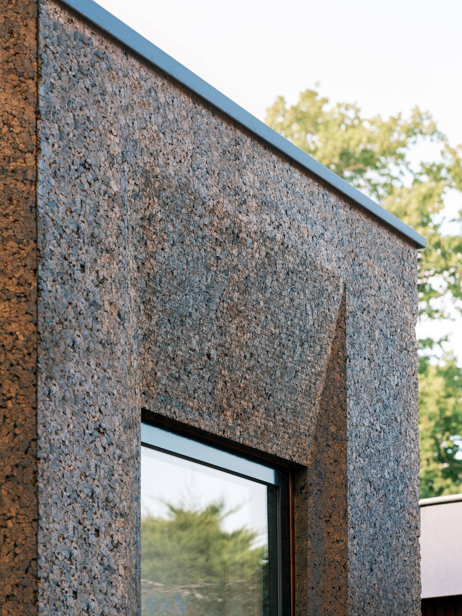 Wat de woonboot écht onderscheidt, is de gevelbekleding van kurk. De hele houtconstructie is omhuld met een ademende schil van geëxpandeerde kurk uit Portugal: een binnenlaag met lage dichtheid, een buitenlaag met hoge dichtheid, verbonden door twee lagen kurkmortel. Dit plantaardige materiaal is waterafstotend, algen- en schimmelwerend, isolerend én digitaal bewerkbaar. Alle kurkmodules zijn computergestuurd gefreesd. Dat resulteert in strakke aansluitingen en elegante details.